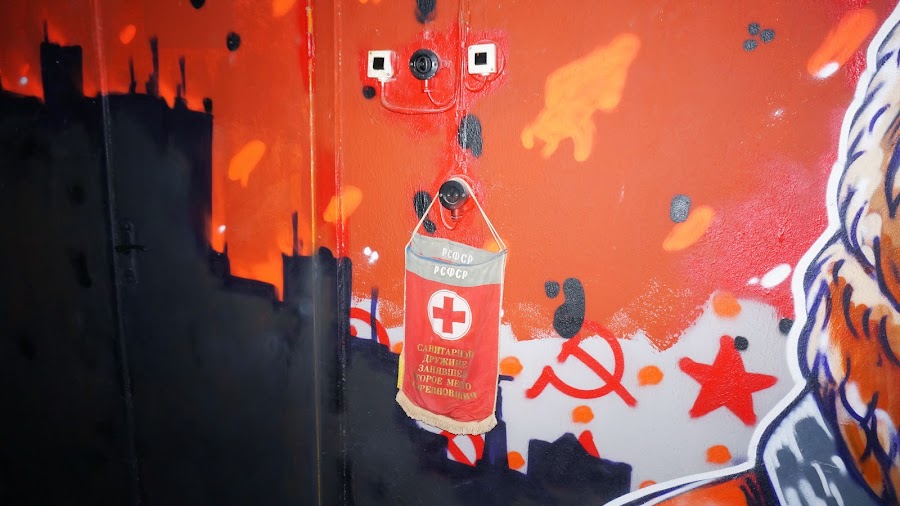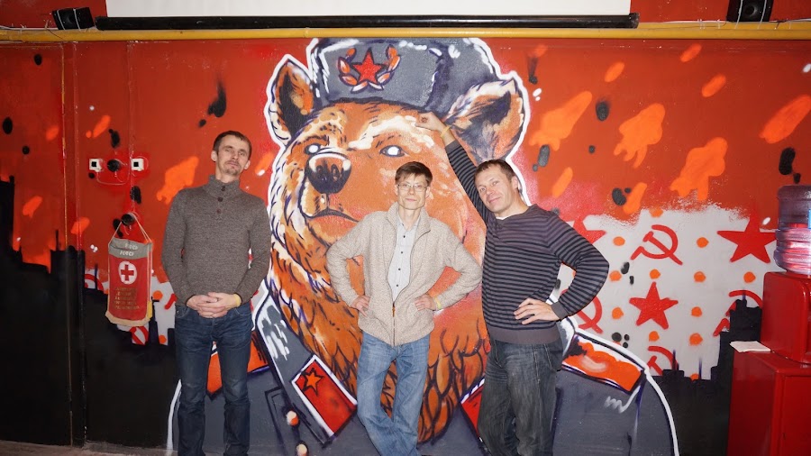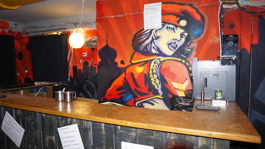 Интересно разрисованные стены на современный лад — русский мишка в фуражке, девицы в боевых доспехах — напомнили мне эпизоды про Россию в голливудских фильмах.