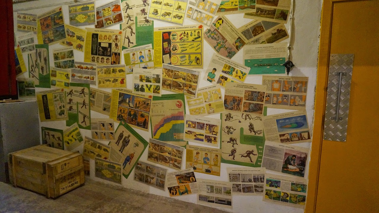 На стенах — плакаты по гражданской обороне СССР.