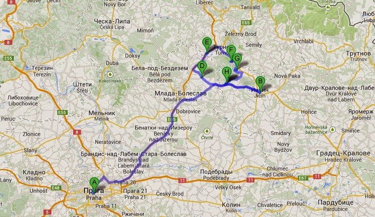 Сегодня, на второй день пребывания в Праге, мы решили отправиться на прогулку по восточной части Чехии. Чешский рай — один из красивейших уголков Чехии. Хотя, что я говорю — в Чехии везде прекрасно: где бы мы не побывали, я всюду находилась под ярким впечатлением от увиденной природной красоты, от великолепия крепостей и замков, пронизанных духом древности и их неповторимости. Вот так выглядит наш сегодняшний маршрут.